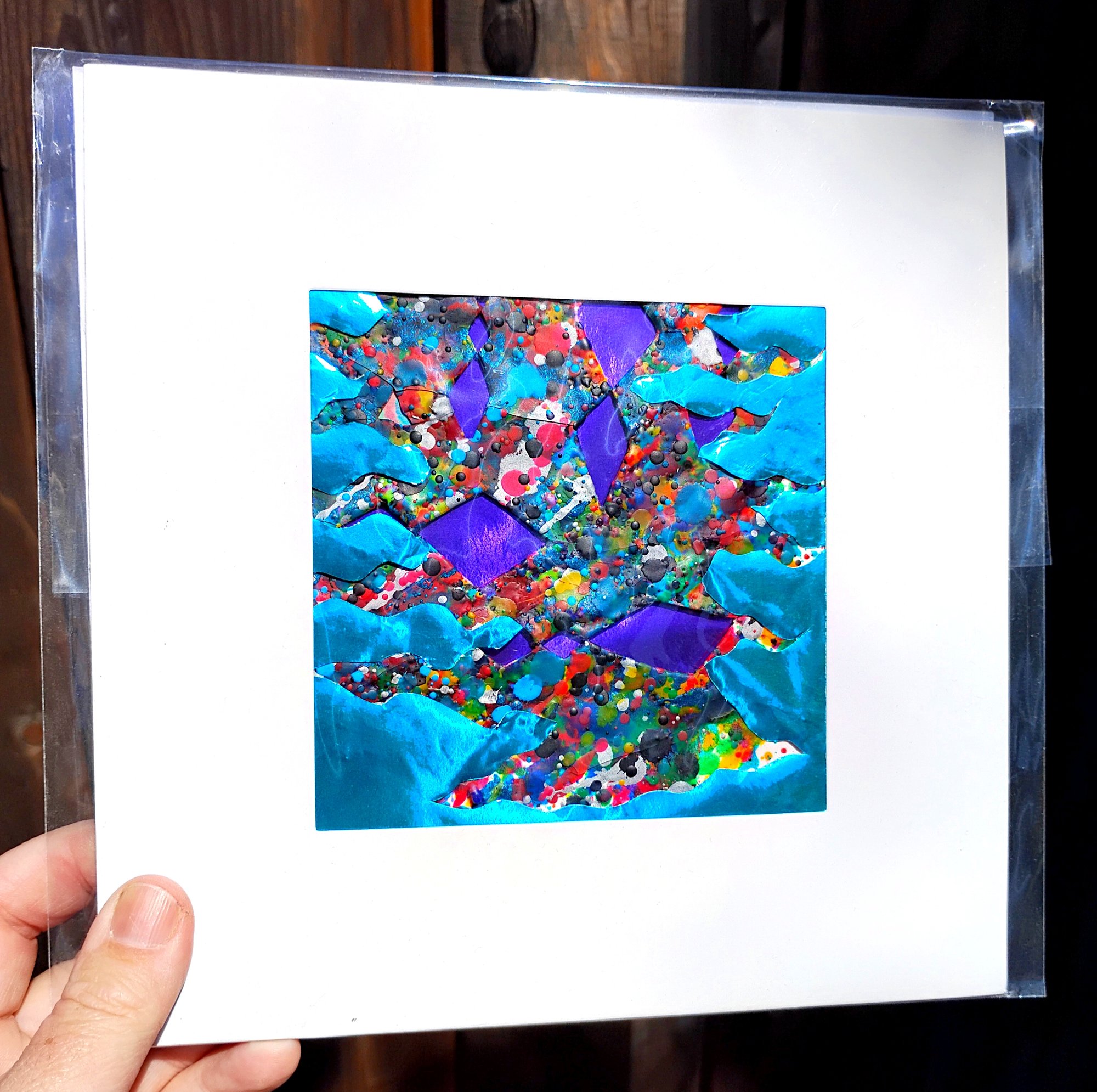 Original abstract flamed crayon and layered paper 8x8 matte.