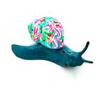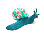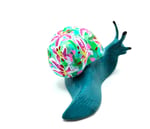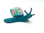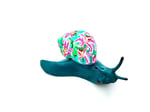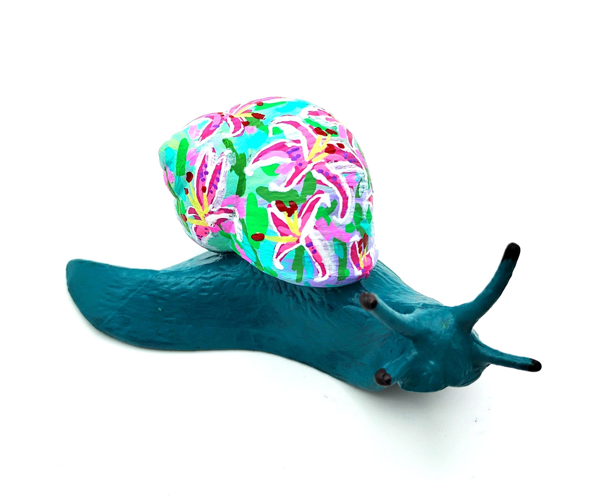 This hand painted snail is a deep Teal with a shell covered in vibrant pink stargazer lilies. It's a solid piece with some weight to it.
