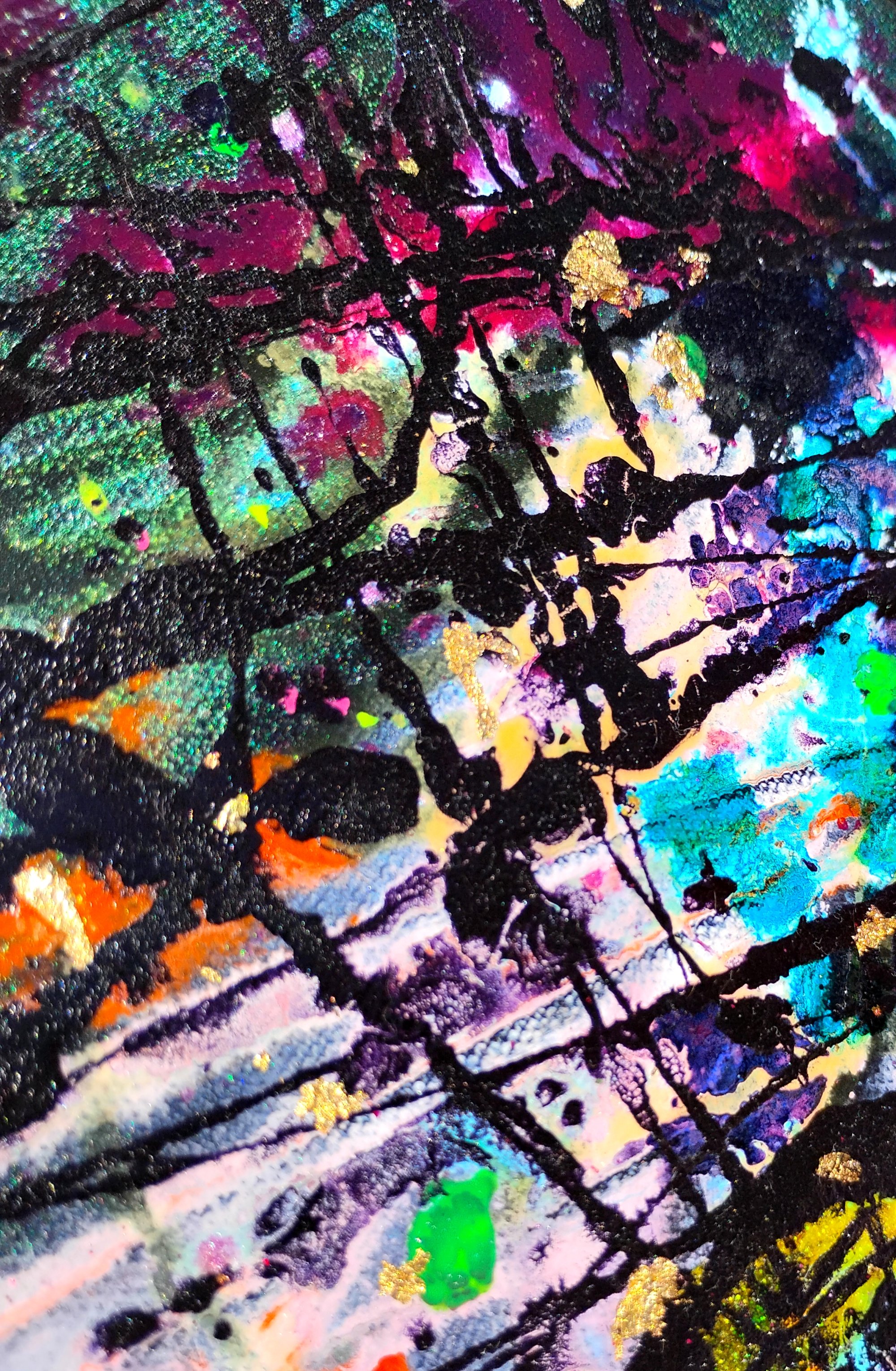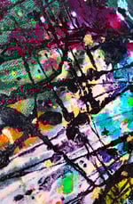 My paintings are about lots of color and overwhelming the eyes. I want the viewer to notice new details with every fresh look, experiencing a range of emotions and unable to look away from the piece. My favorite materials to use: acrylic, ink, gold foil, glitter.