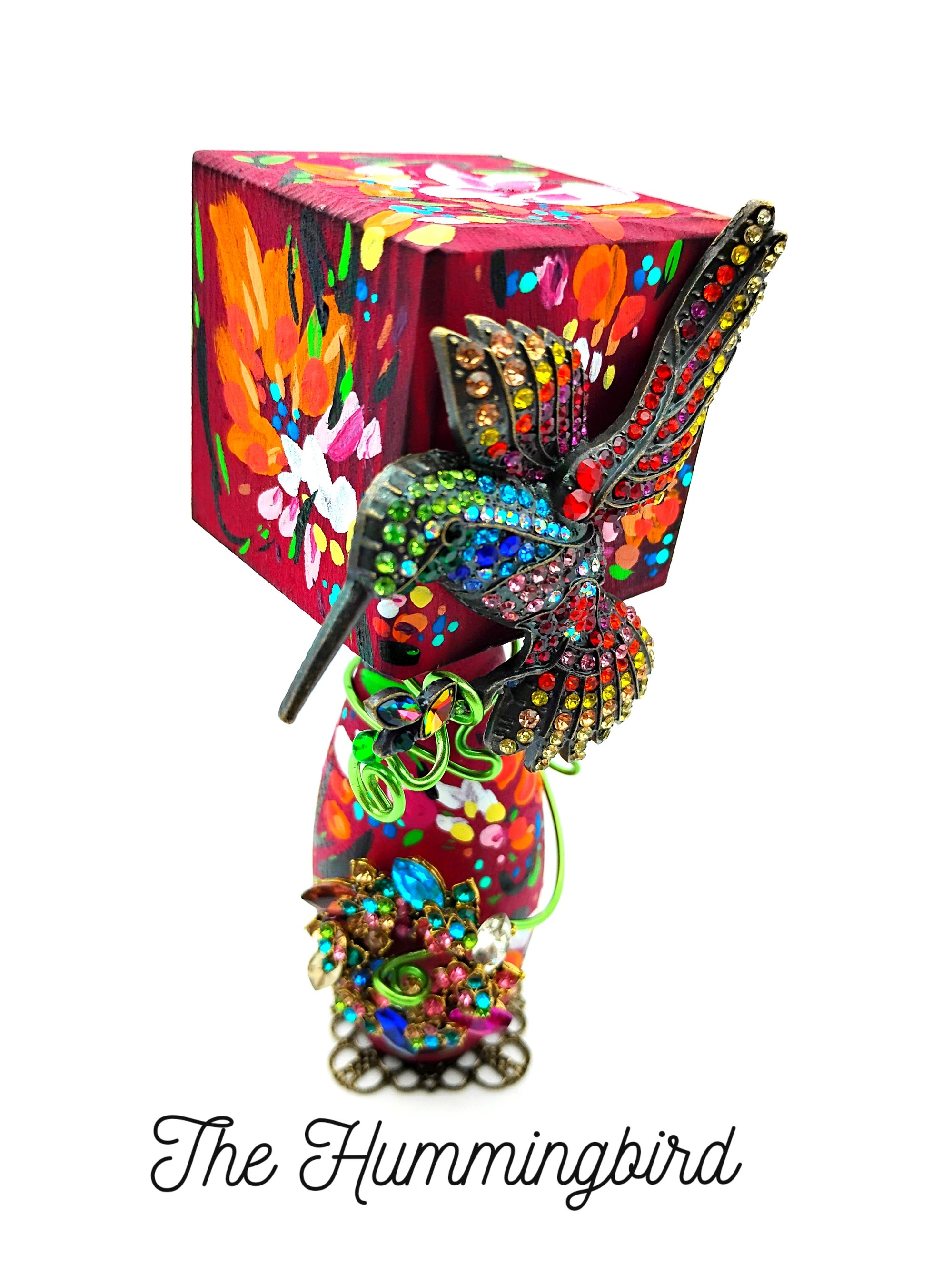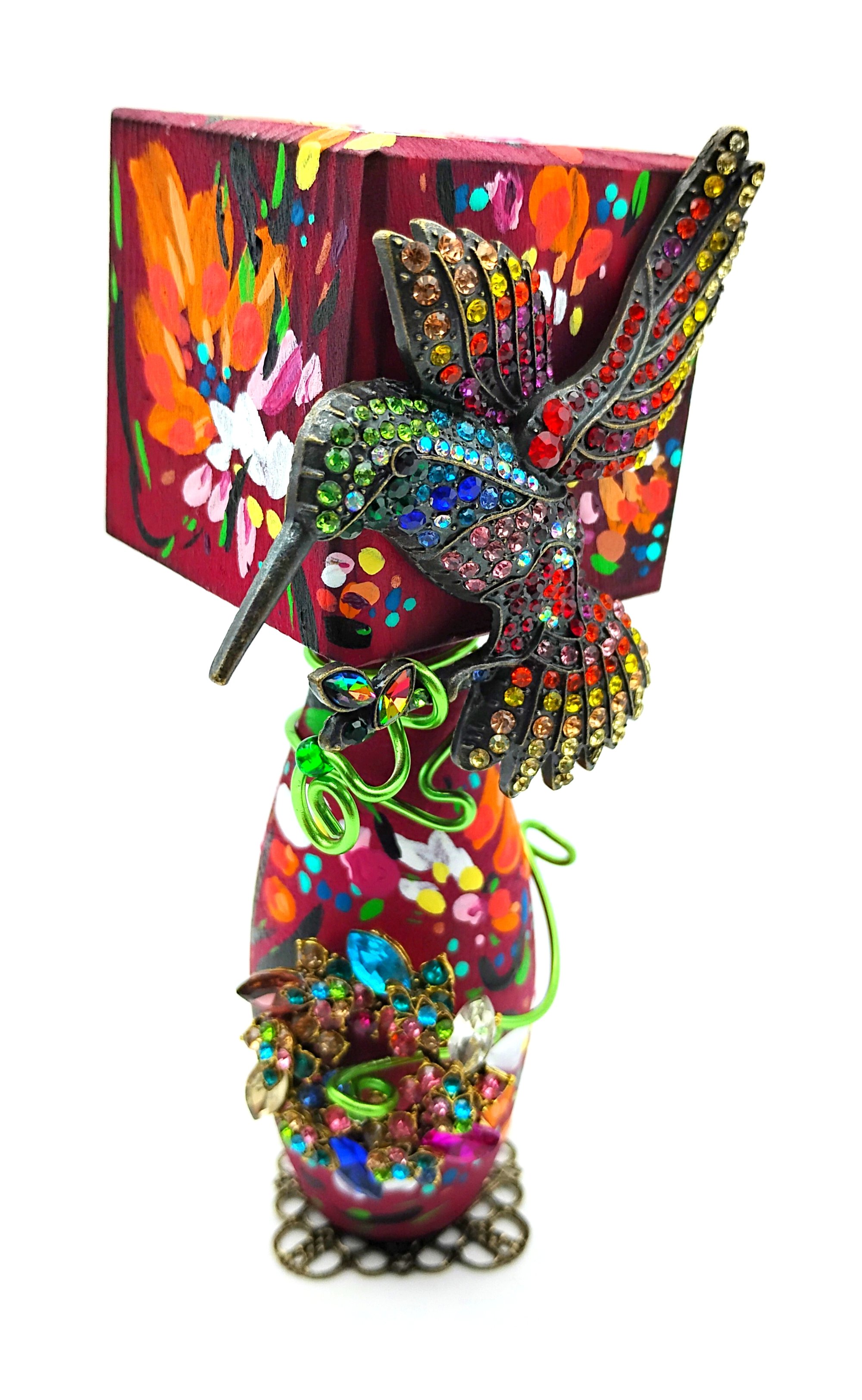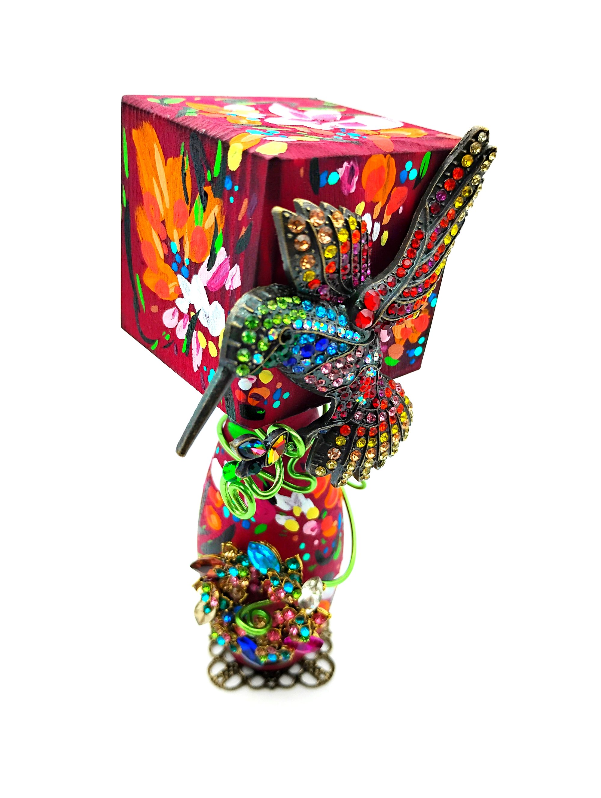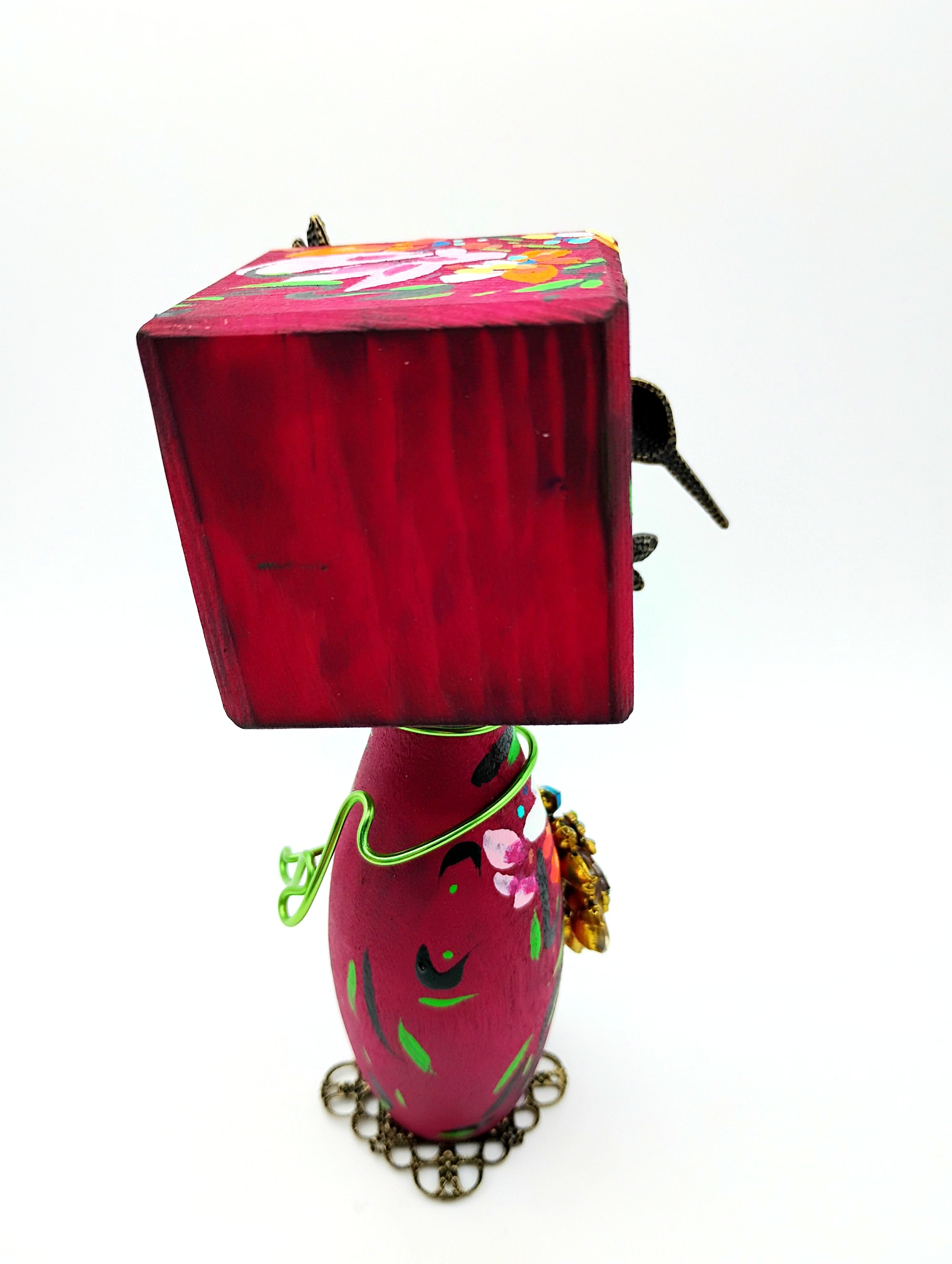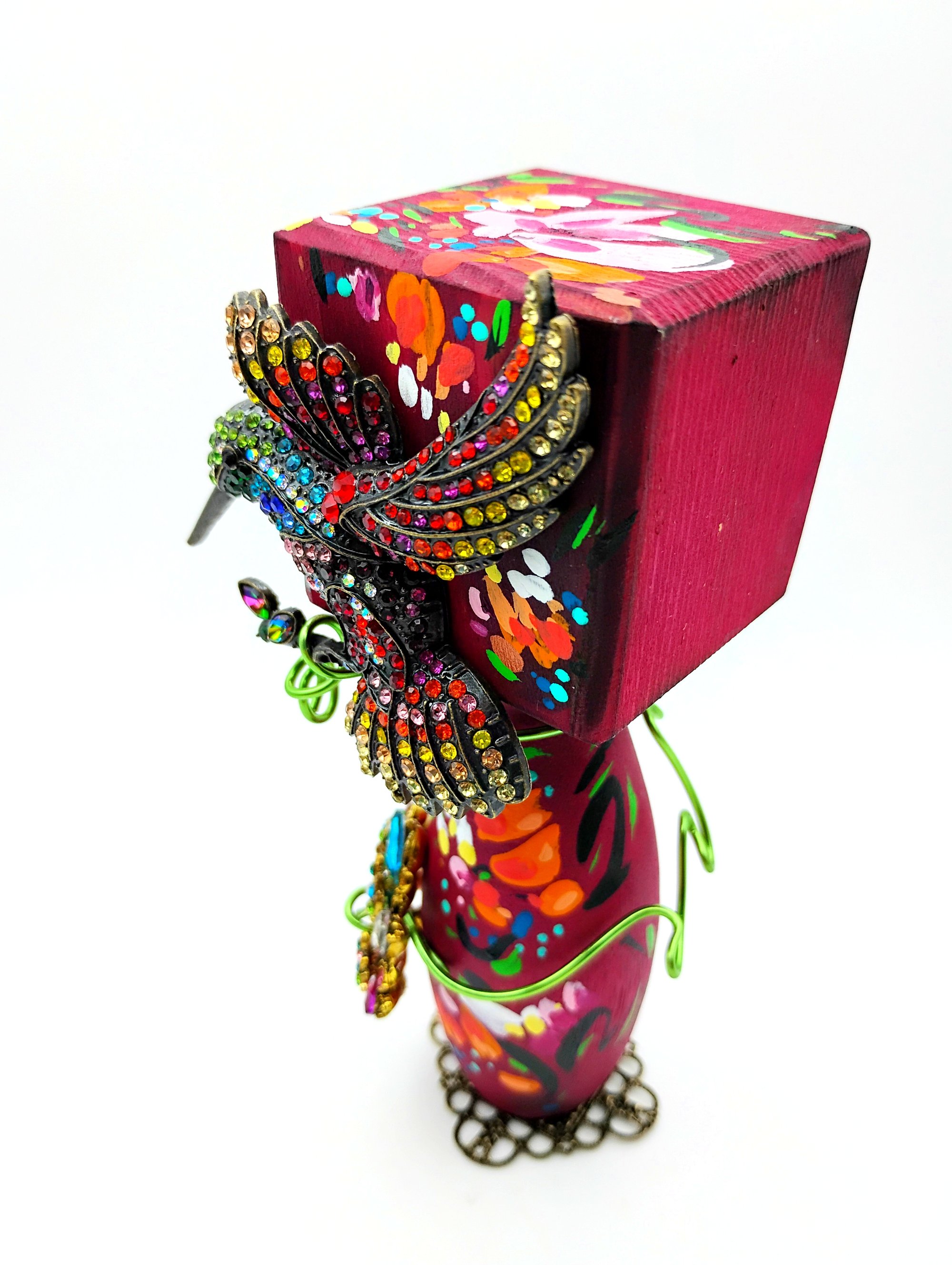 This one of kind wood hummingbird sculpture is painted a wine red and burned to give it a distressed base. With a rainbow bejeweled hummingbird on one side of the wooden block head and colorful abstract flowers floating around the other faces and down the trunk. A green wire wrapped climbing the figure.